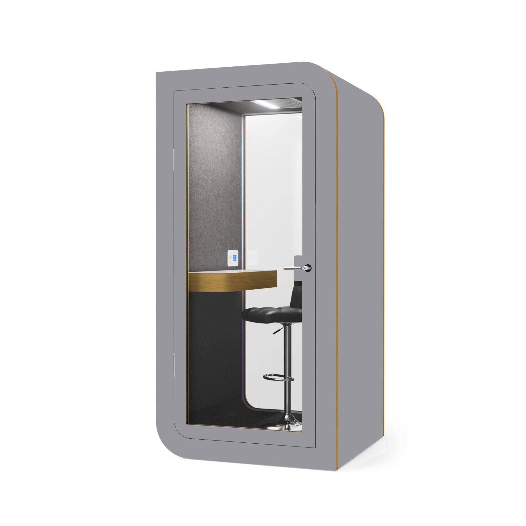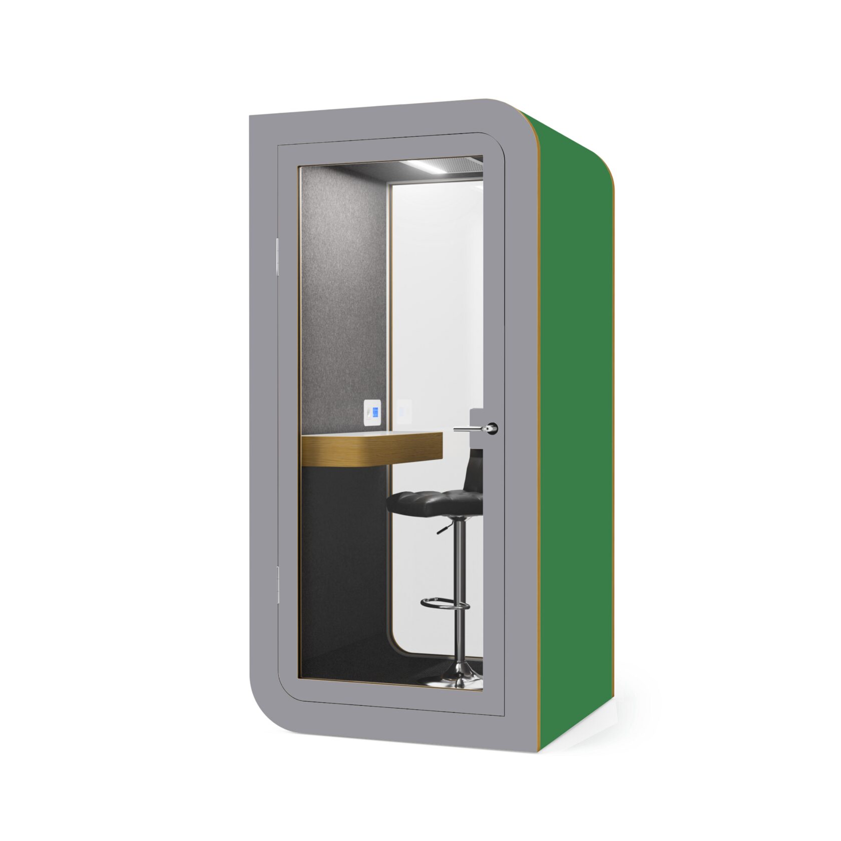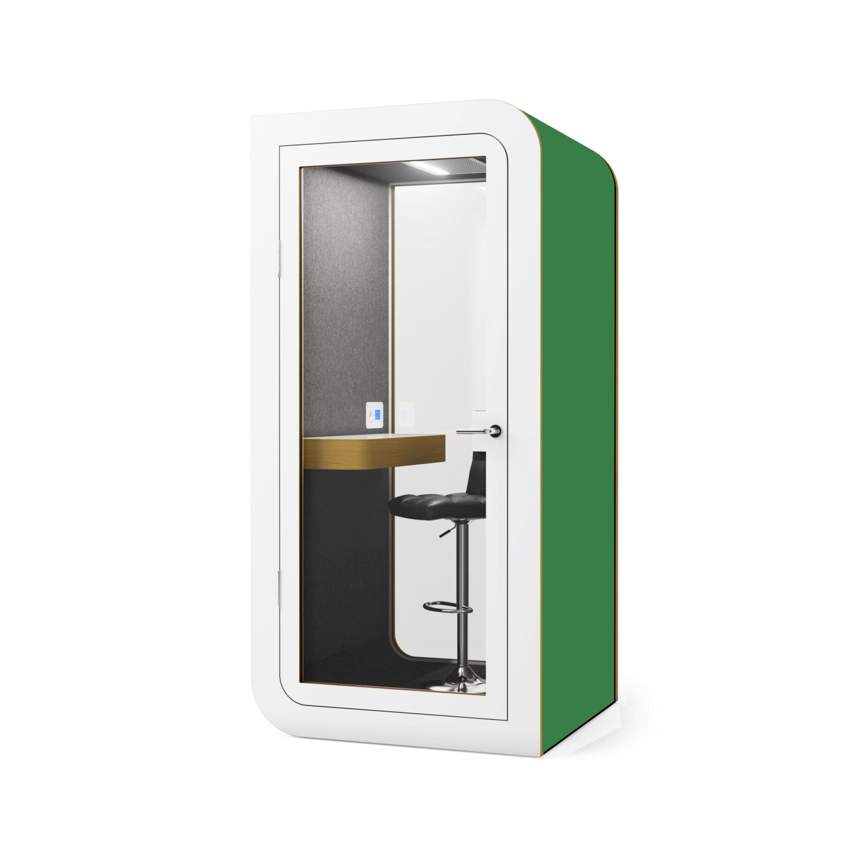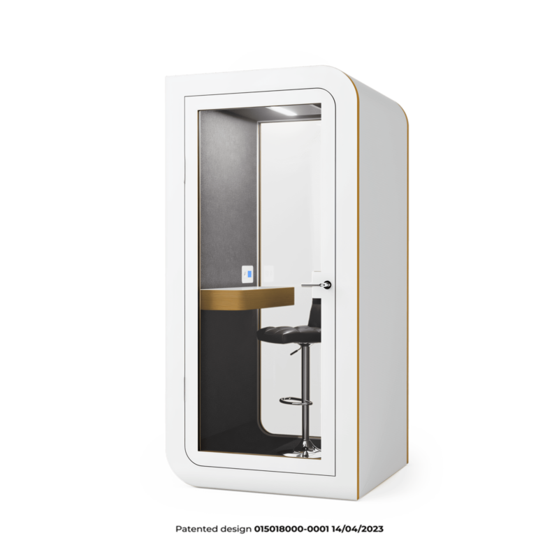 Die Kabine ist innerhalb von 60 Minuten installiert, kann leicht verschoben werden und ist mit einer geräuscharmen Belüftung, USB-Anschlüssen und einem bequemen Laptop-Tisch ausgestattet. Sie bietet alles für einen reibungslosen Betrieb und absolute Konzentration.